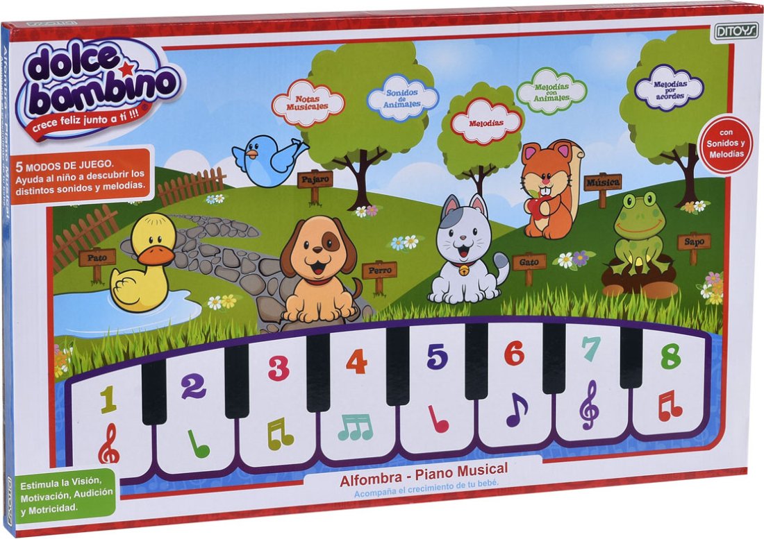 Estimula la visión, motivación audición y motricidad. Trae notas musicales, sonidos de animales, melodias de animales y melodías con acordes.
