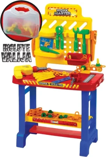 Pequeños trabajadores con grandes ideas adoraran jugar con los bancos de trabajo. En la mesada podrán armar y reparar con la gran variedad de herramientas y accesorios. En el estante inferior podrán almacenar las piezas terminadas y en el tablero colgar las herramientas, casco y teléfono. También explorarán sus capacidades creativas y sus habilidades motoras con el martillo, destornillador, pinza, serrucho y maquina agujereadora.