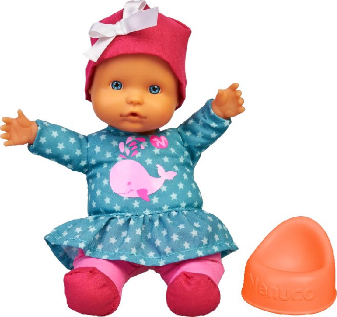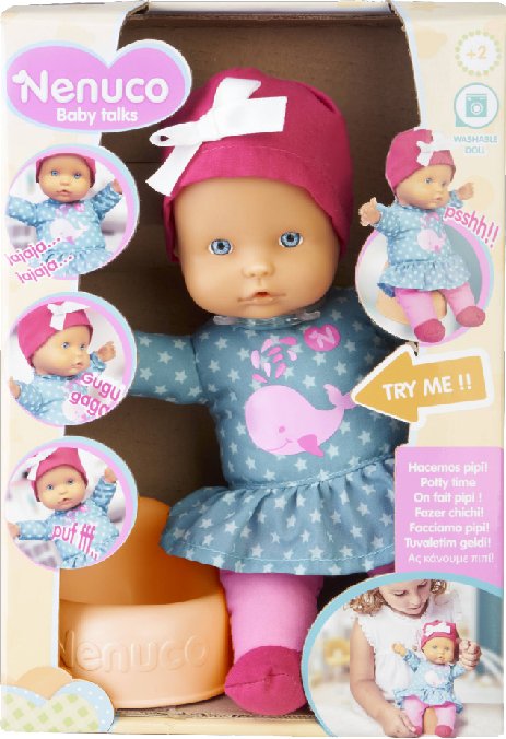 Nenuco Baby Talks- hacemos Pi pi Bebote con diferentes sonidos de bebés y a la hora de ir al baño.viste un vestidito rosa con un gorrito a juego e incluye su propia pelela naranja.. Pilas incluidas
