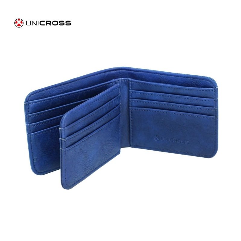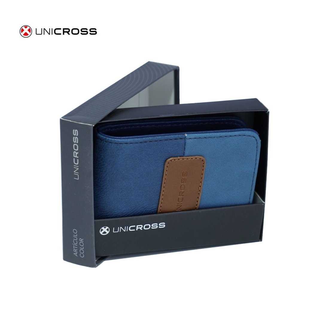 Billetera Unicross, cuenta con una divisiones para billetes y un volante en el medio. espacios para tarjetas y credenciales, en su parte posterior podemos ver otro espacio oculto para tarjetas.