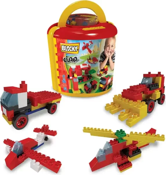 La nueva línea de Baldes Blocky tienen una estética totalmente renovada, cuentan con una cúpula transparente que dejan ver las coloridas piezas Blocky. La temática de los nuevos baldes, Ciudad para los niños y Ciudad Encantada para las niñas, permite armar mas de 15 modelos por balde. Contenido:
