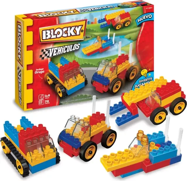 Con Blocky los chicos pueden armar miles de aventuras y ahora podés construir todos los vehículos que te imagines. Blocky estimula la creatividad, la imaginación, incentiva el razonamiento y favorece la interacción con otros chicos. Incluye: