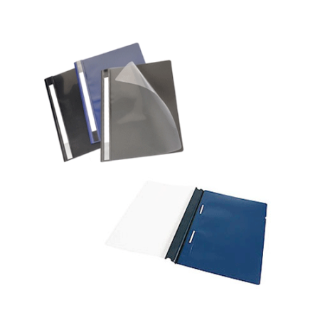 Carpeta tamaño A4 de tapa transparente, su base es una lámina de PVC rígido opaco color Negro. Su frente es PVC rígido cristal de 170 micrones.