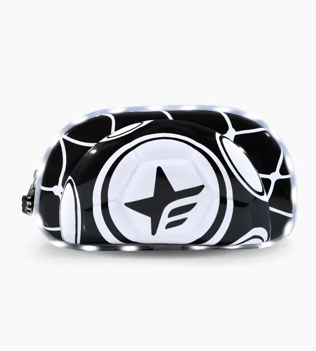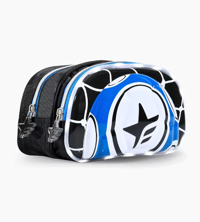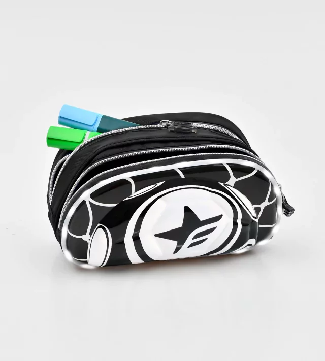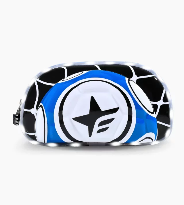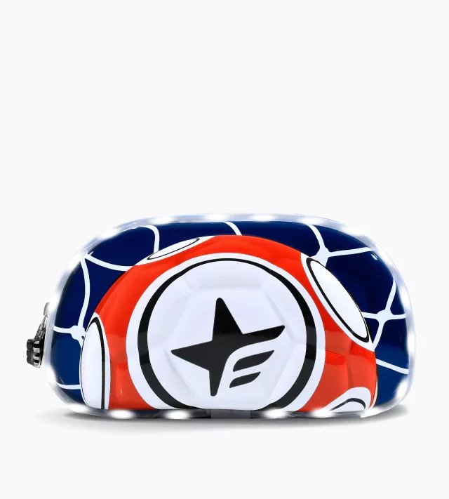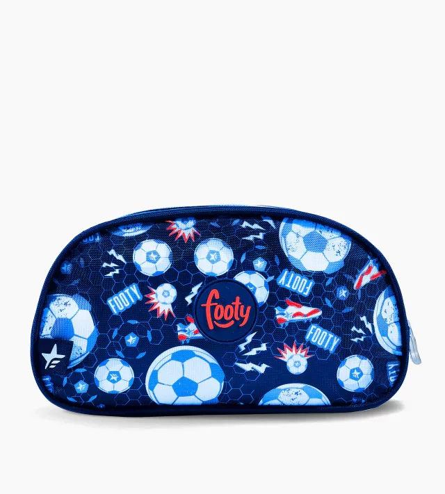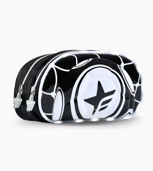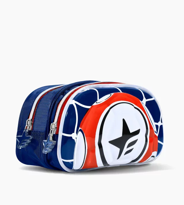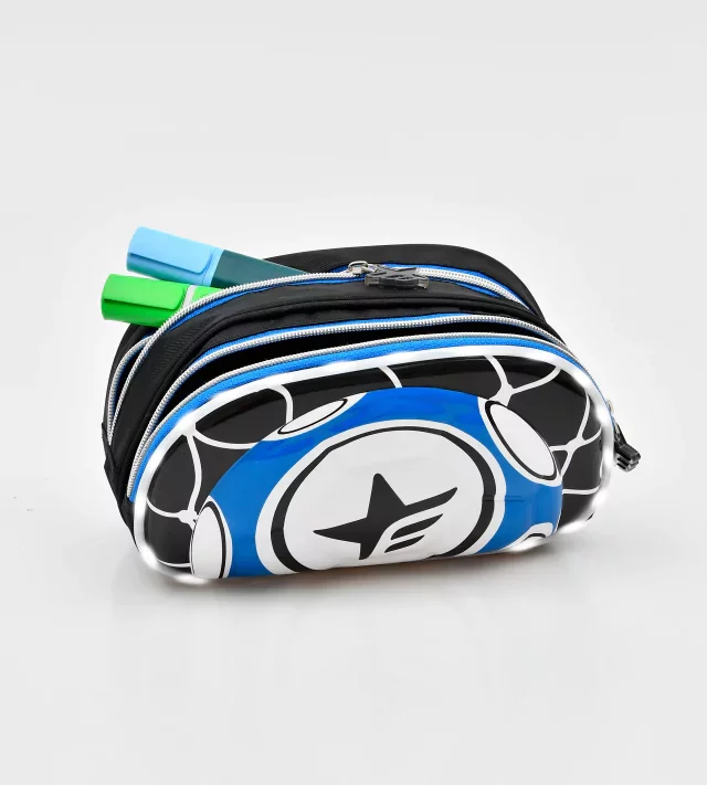 Cartuchera grande 2 cierre con LUCES LED a pila. Frente termoformado y estampa sublimada atrás. Dos compartimentos con tira cierres de isologo Footy.