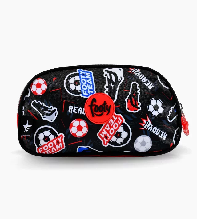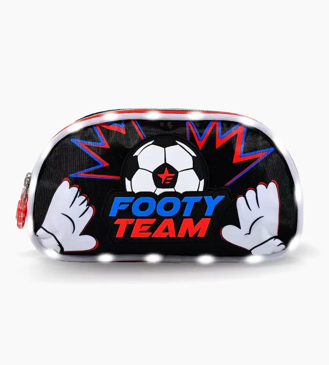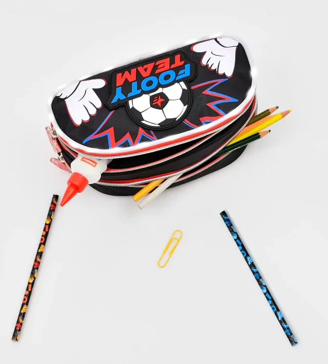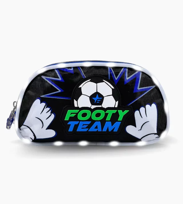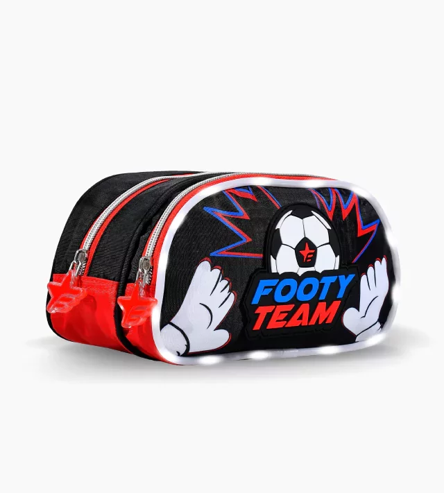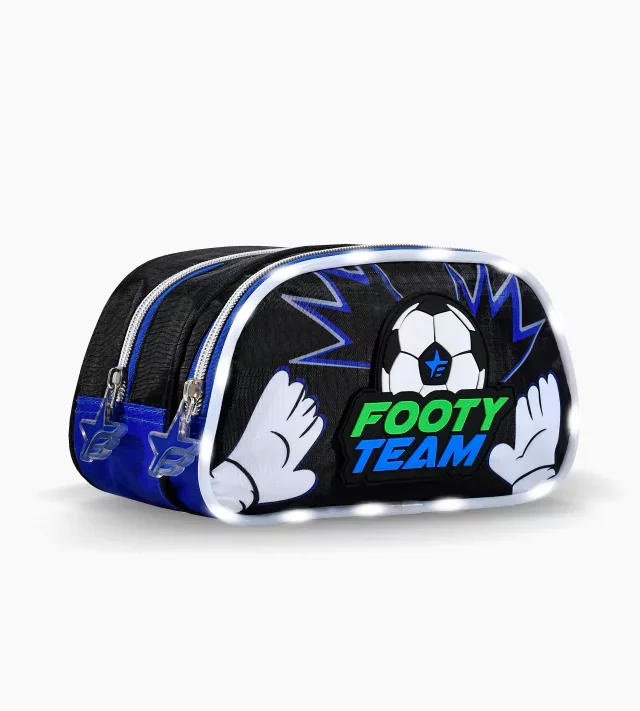 Cartuchera grande 2 cierre con LUCES LED a pila. Estampa sublimada Dos compartimentos con tira cierres de isologo Footy.
