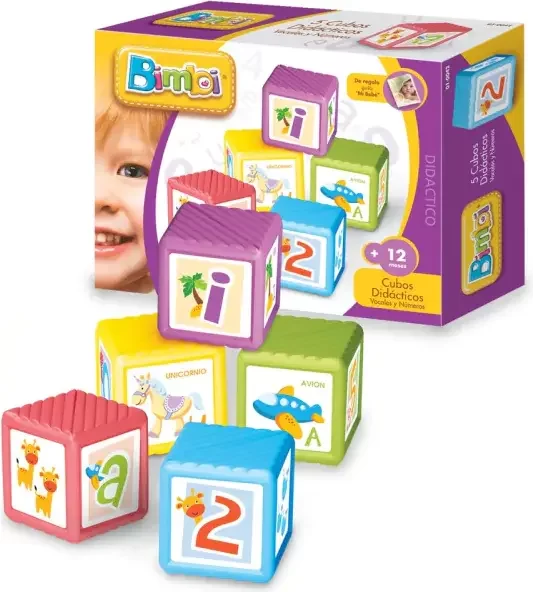 - 5 cubos apilables para aprender las vocales y los números del 1 al 5.