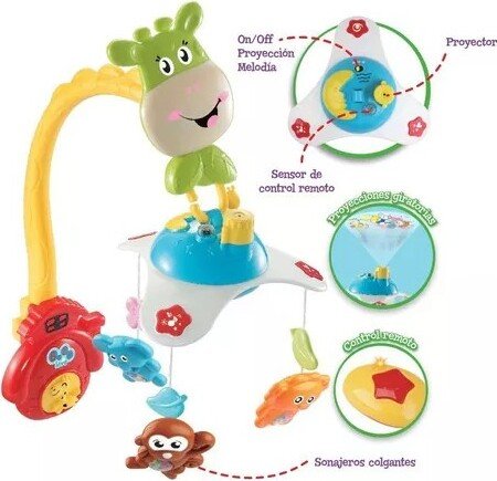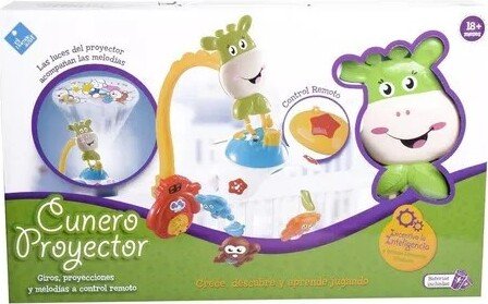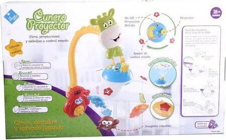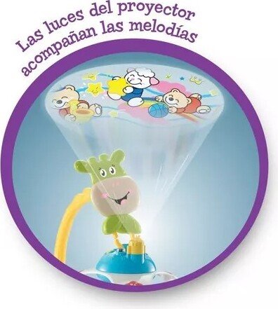 Con hermosos muñecos y colores brillantes, este cunero ayudará a desarrollar las habilidades visuales y auditivas de los bebés. Y con su función de proyector, en el techo podrán observar divertidas y tiernas imágenes que le harán compañía al bebé hasta que concrete el sueño.