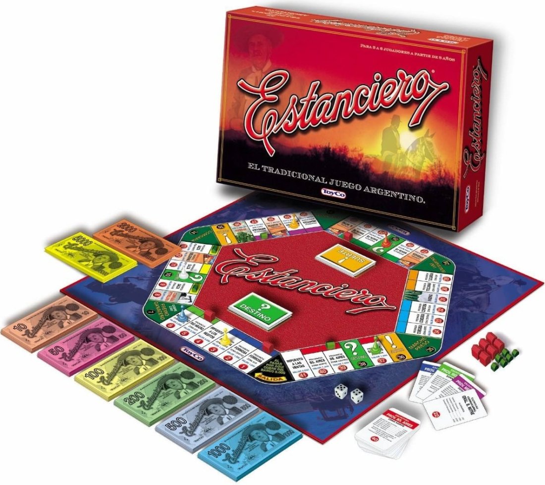 1 tablero. 6 peones distintos colores. 2 dados. 28 cartas escrituras. 32 cartas suerte y destino. 32 chacras. 12 estancias. Billetes de diferente denominación. Instrucciones.