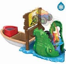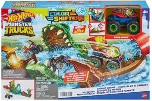 Con el conjunto de juego Monster Trucks Swamp Chomp Color Shifters de Hot Wheels, puedes aplastar y chocar para generar una ola de sorpresas de cambio de color con la que vivir grandes emociones. Lanza el Piran-ahhh de Color Shifters incluido y cuando caiga en la boca del caimán llena de agua helada, empezará a cambiar de color y tendrá un aspecto completamente nuevo. Vuelve a lanzar el camión para enviarlo a través del cartel hasta un barco, donde se puede rociar con agua templada para cambiar de color una vez más. Repite las acrobacias para repetir los cambios. El barco extraíble y la taza en la boca del caimán evitan derrames y mantienen el agua contenida en el área de juego. Los colores y la decoración pueden variar.