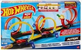¡Recorre este épico circuito y atraviesa los loopings para ver quién puede completarlos todos y conseguir el mayor número de puntos! El primero que supere el looping gigante lo romperá y hará que el resto de coches se estrellen. Con el conjunto Multi-Loop Raceoff de Hot Wheels pueden jugar tanto uno como dos jugadores para multiplicar la competición. Registra los puntos con las banderas, que bajan automáticamente cuando pasa el coche. En el modo de un solo jugador, supera el reto de la distancia y amplía el circuito hasta más de 60cm, con cinco loopings repartidos por el camino. ¡Combina este conjunto con otros conjuntos de Hot Wheels (se venden por separado) para que la carrera no se acabe nunca! Incluye 1 vehículo Hot Wheels para proporcionar un juego completo que hará las delicias de los niños de 4 a 10 años.