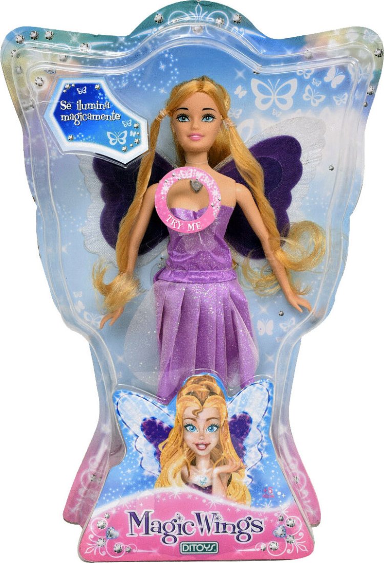 La muñeca Magic Wings se ilumina mágicamente presianando su corazón.