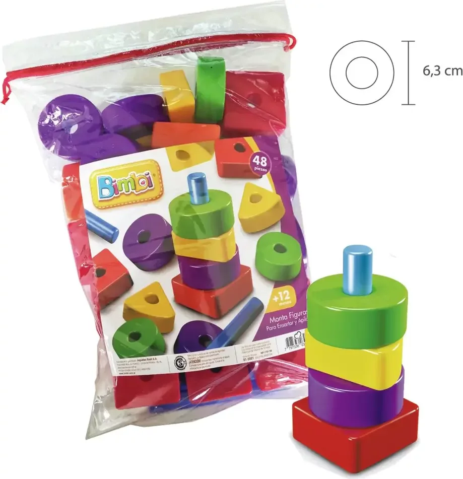 Monta Figuras estimula la destreza manual y la coordinación ojo-mano. Su simplicidad favorece el armado de figuras a los que el niño puede asignarle significados. El contraste de colores y los brillos de las piezas facilitan la diferenciación. Ayuda a desarrollar habilidades relacionadas con el planeamiento motor. La línea Bimbi acompaña al bebé en todas las etapas de su desarrollo. Incluye: 48 piezas plásticas de diferente colores y formas