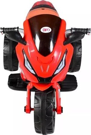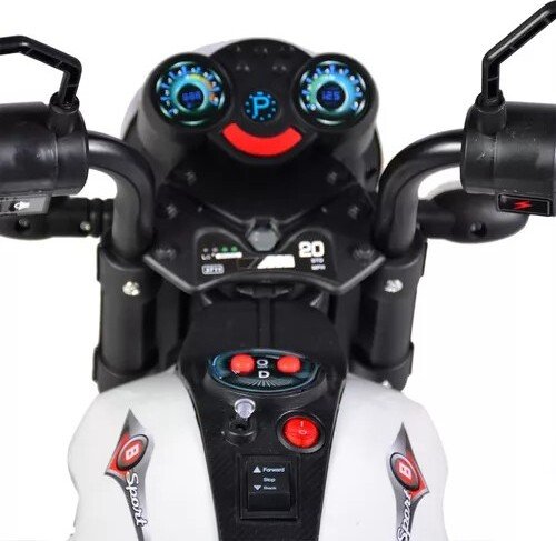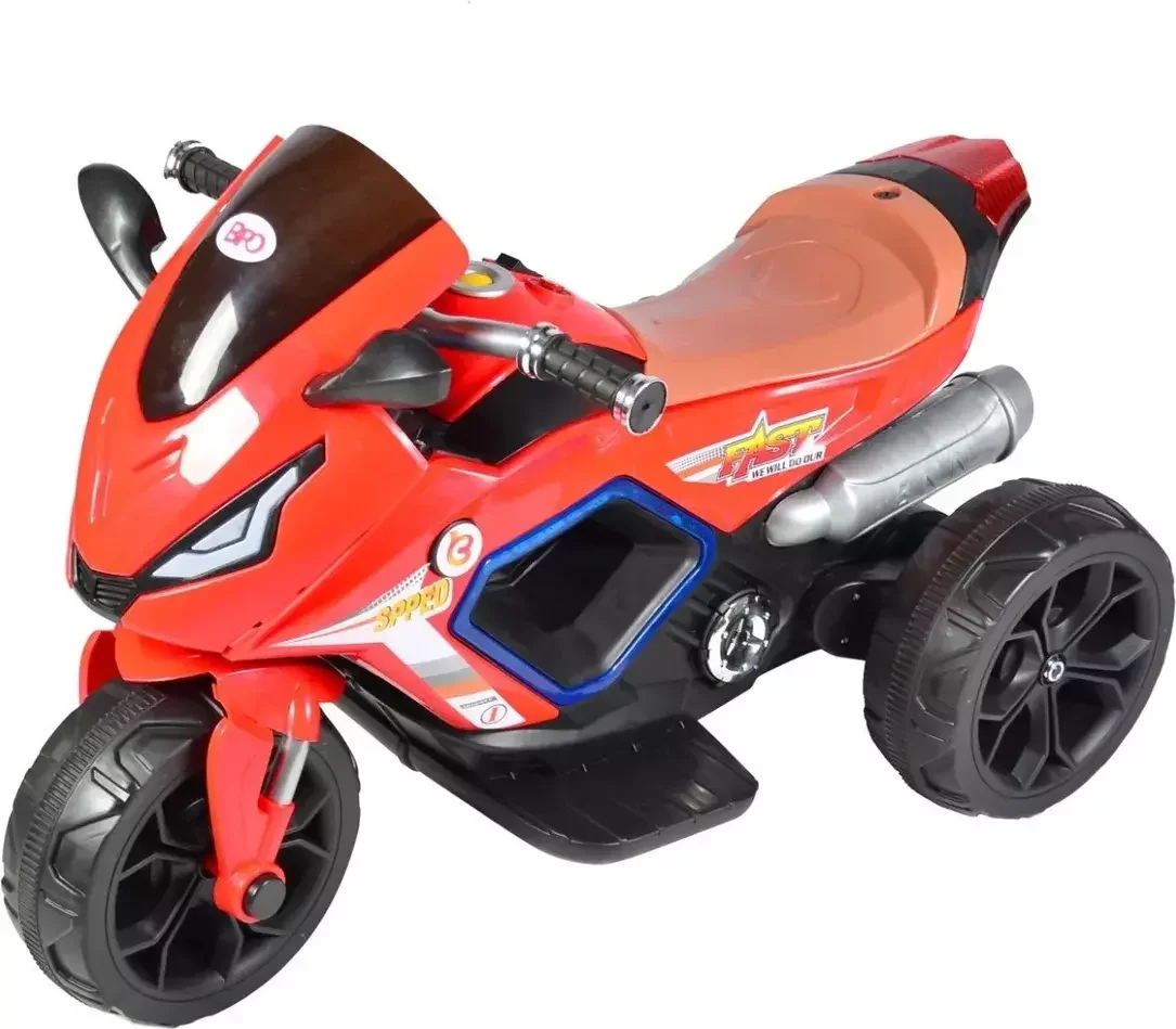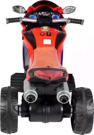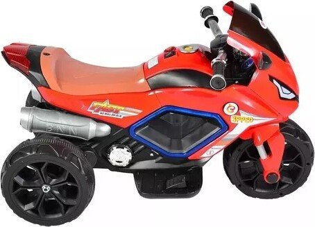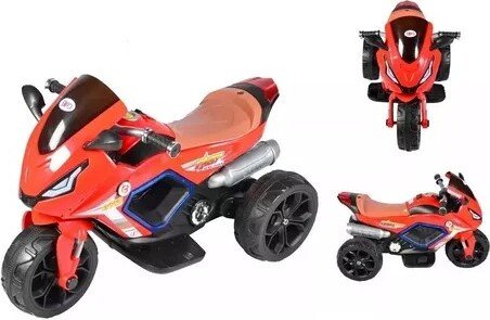 Moto a batería de 3 ruedas Acelerador a pedal Escape con humo y luces Luces en cuadro Estéreo: USB, AUX, MP3 Dos motores 6V Medidas: 84 x 48 x 56 CM COLORES: NARANJA Y ROJO