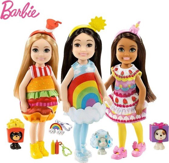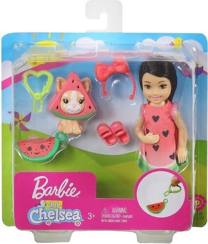 Barbie Club Chelsea Muñeca Muñeca disfrazada con accesorios. Elige entre los diferentes modelos. Sujeto a disponibilidad en tienda. Entre los disfraces se encuentran un vestido o una falda con un tierno estampado, un cintillo con forma y zapatos coloridos. Cada muñeca viene con un amigo gatito vestido con un disfraz a juego y un dije de llavero: engancha a la muñeca Chelsea una mochila o ropa y lleva la diversión de los disfraces a todas partes. ¡Las niñas pueden crear muchas historias divertidas con la muñeca Chelsea con disfraces temáticos! Cada muñeca disfrazada lleva un estilo único: elige entre un disfraz temático de unicornio, sandía o gato.