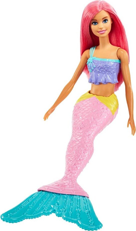 ¡Sumérgete en un mundo de cuento con la sirena de Barbie! Su corpiño morado está decorado con estrellas turquesa, en su cola rosa se detalla un volante y escamas amarillas, y su aleta turquesa aporta otro chapuzón de colores. Su pelo rosa brillante completa el look de fantasía. La cintura de la muñeca se puede doblar para jugar a que las sirenas nadan en el mar o se sientan a tomar el sol. Colecciona todas las muñecas y juguetes de cuento de hadas de Barbie para zarpar hacia tierras mágicas donde las aventuras nunca se acaban y se puede dar rienda suelta a la imaginación (se venden por separado y están sujetas a disponibilidad).