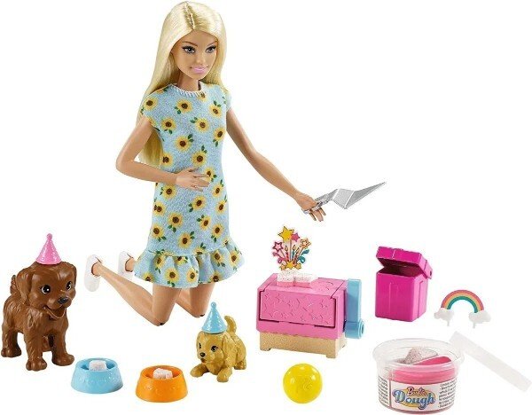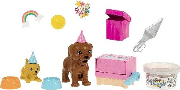 Este conjunto de juego de mascotas Barbie combina el juego con masa con una fiesta de cachorros, para divertirse con las manos e imaginar dulces historias. Llena el molde de tarta con masa de dos colores, y empuja la palanca para ver cómo sube la masa y se convierte en una adorable tarta en forma de hueso. Decora las golosinas con los adornos de tarta incluidos, con temas de arco iris y confeti de estrellas, y sírvelas en cuencos de perrito llenos de colorido. ¡El cachorro más grande puede masticar al apretarle la cola! Otros accesorios incluyen gorros de fiesta de cachorro, una pala de servir tarta y una caja de regalo que se abre y se cierra para guardar una pelota de juguete para los cachorritos de Barbie. Barbie puede doblar las rodillas para añadir realismo a las historias y lleva un vestido informal con estampado de girasol y zapatos blancos.