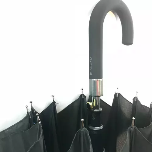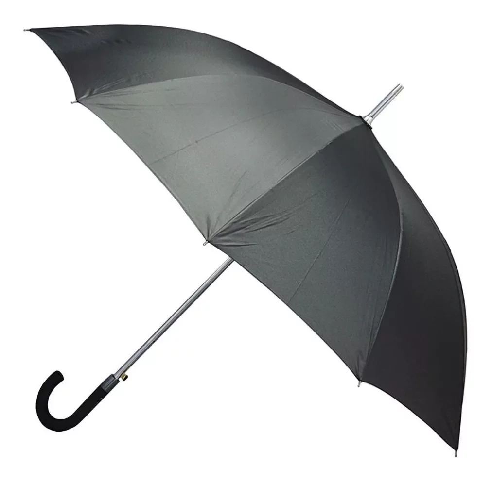 Paraguas AMAYRA largo semi automático listo. Tiene 10 varillas siliconadas y mango curvo. Incluye funda de guardado.