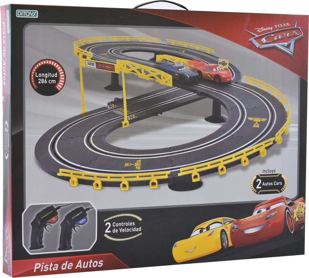 Incluye 2 autos de cars racing y 2 controles de velocidad. Tiene una longitud de 286 cms. para realizar carreras por vueltas super divertidas.