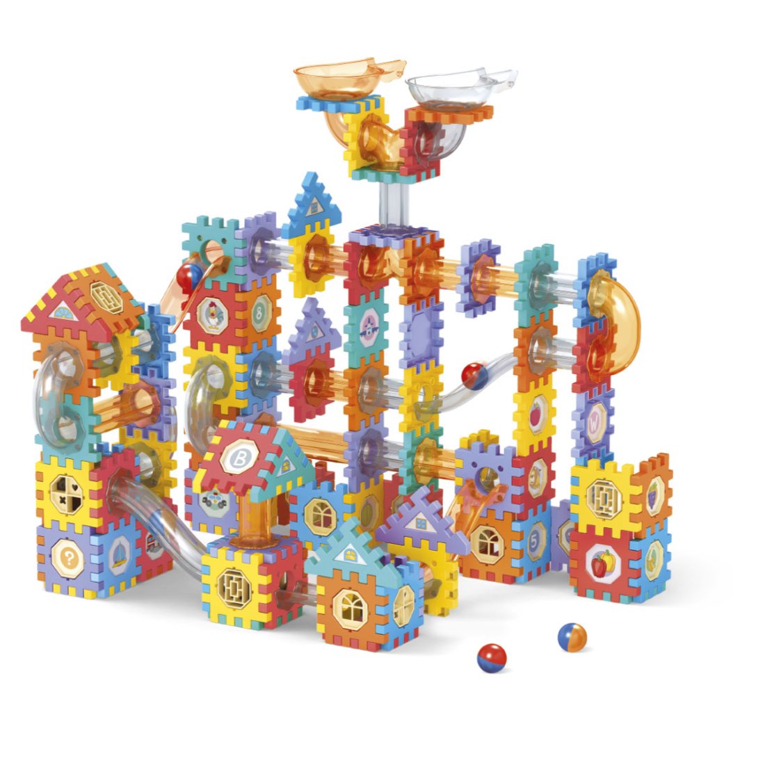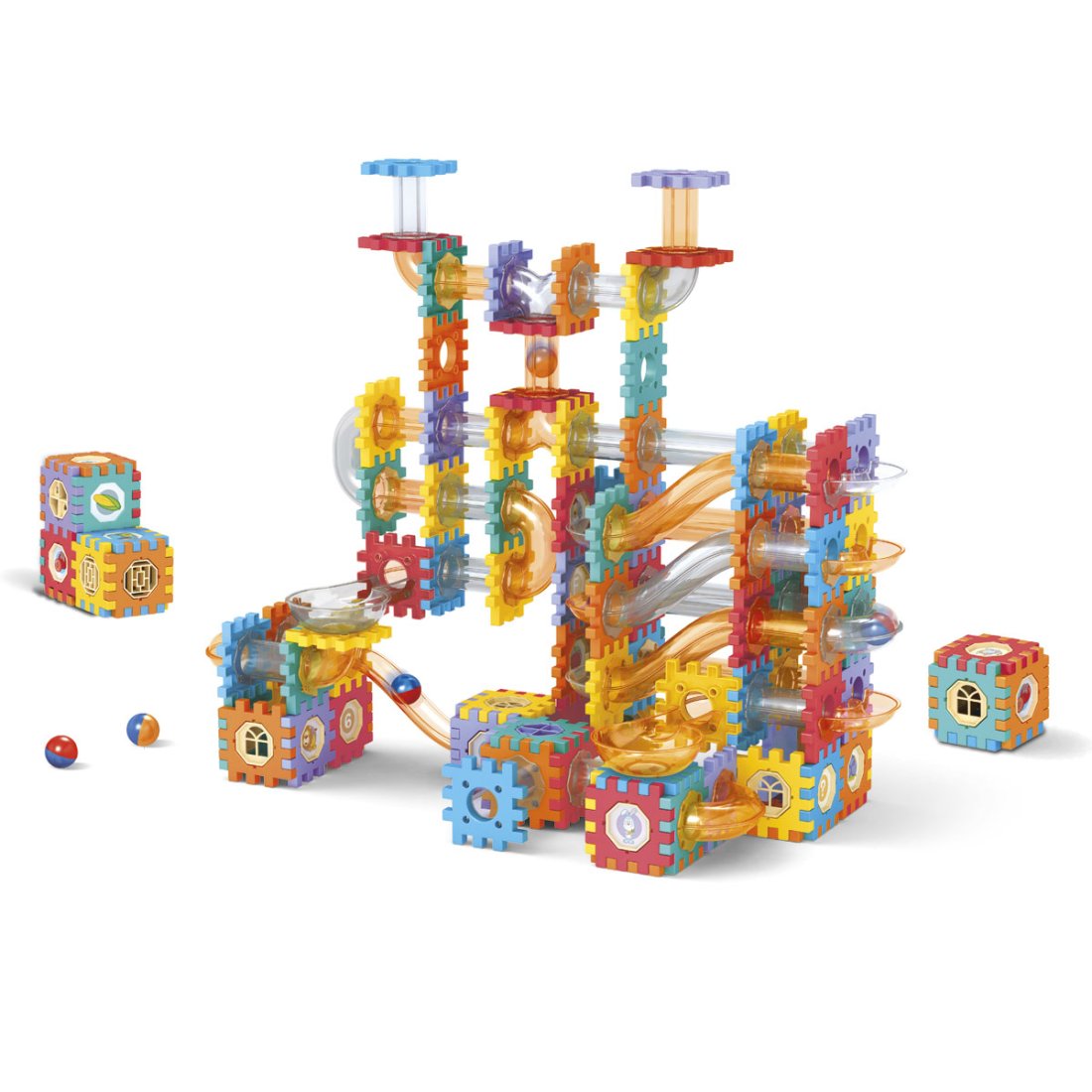 Las pelotitas miden aprox 2cm de diámetro. Los bloques miden aprox 5,5cm.