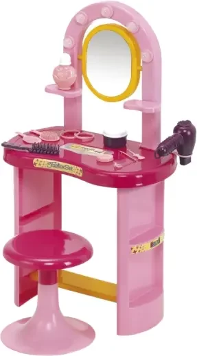 Tocador con espejo regulable. banquito, cassette de maquillaje para pintarse de verdad y peine, cepillo, pulseras, anillos, frasquitos de perfume y un cajoncito para guardar ordenadamente todas sus cosas.