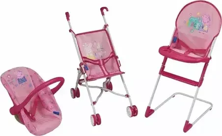 • Producto Peppa Pig • Set para muñecas • Cochecito paragüitas • Sillita de comer • Huevito • Packaging individual full color