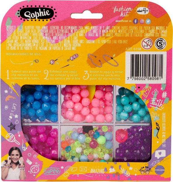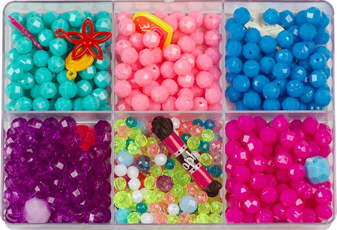 Bijouterie para armar en caja cristal Mostacillas surtidas y dijes 6 divisiones Nº1. Edad recomendada desde 5 años. Peso: 3.652 kg Dimensiones: 40 × 20 × 20 cm