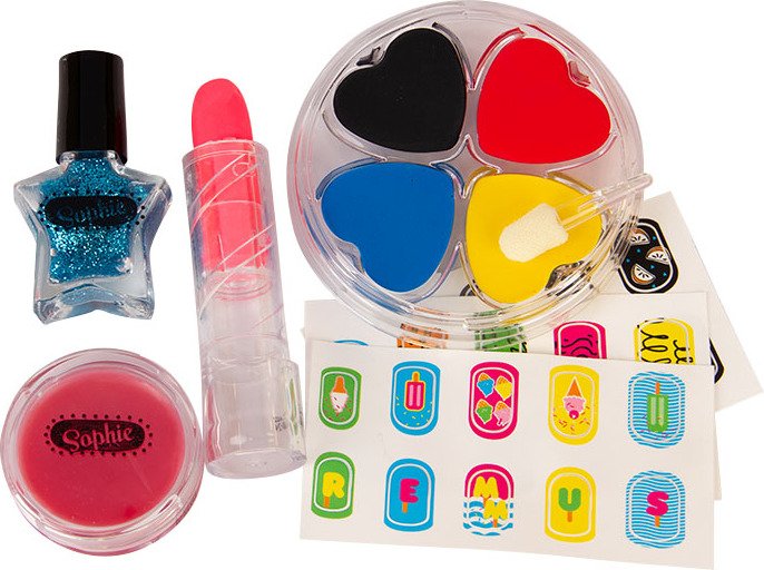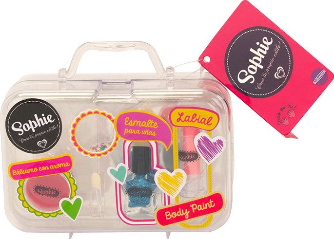 Valijita Sophie Belleza. Incluye: maquillaje artístico, stickers uña, perfume en crema, esmalte y brillo uñas, lápiz labial, aplicador. Peso: 1.32 kg Dimensiones: 30 × 25 × 15 cm