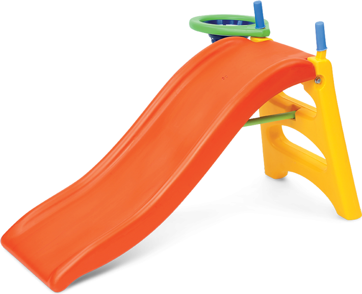 Plegable. Bajada ancha con descanso y ondas. Pasamanos de seguridad. Escalones antideslizantes. Con aro de básquet. dimensiones 105 x 34 x 58 cm