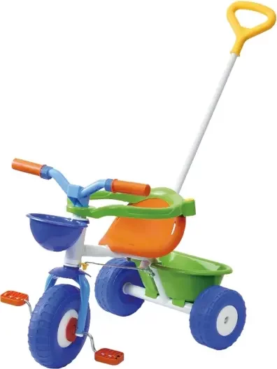 Con estructura metálica. Podrán cargar sus canastos delantero y trasero. Los niños pueden sentarse en forma segura gracias a su aro de contención, pedales anti-deslizantes que también funcionan como apoyapies gracias al sistema de embriague y barra de arrastre para pasear llevados por un mayor.