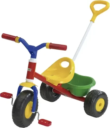 Triciclo de estructura metálica. Tiene embrague para frenar los pedales, portaobjetos y barra de arrastre.