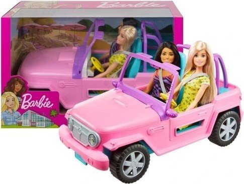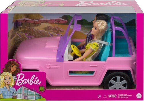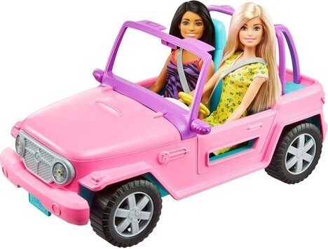 ¡Inspira el viaje en coche definitivo con las dos muñecas Barbie y su vehículo listo para la aventura! El exterior del vehículo todoterreno es de color rosa y tiene un diseño característico, como el detalle del logotipo de Barbie y la matrícula personalizada. Las ruedas giran y tiene un aspecto genial; las niñas podrán sentar dentro a las dos muñecas Barbie, ponerles el cinturón y llevarlas a cualquier lugar que puedan imaginar. Ya sea en un viaje informal o en una aventura todoterreno, las posibilidades de divertirse con estas muñecas Barbie son infinitas, porque con Barbie puedes ser lo que tú quieras. Las muñecas no pueden tenerse en pie por sí solas. Los colores y la decoración pueden ser distintos de los mostrados.
