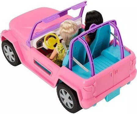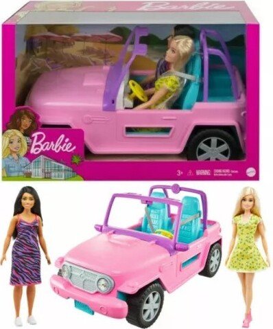 Crea el mejor viaje en coche con tus mejores amigas con este conjunto de Barbie que incluye 2 muñecas y su vehículo listo para la aventura. El vehículo todoterreno tiene una colorida carrocería rosa con detalles morados y un interior azul brillante. Los detalles del logotipo de Barbie y una matrícula personalizada le dan un toque de estilo propio. Las ruedas giran y tiene un aspecto genial; las niñas podrán sentar dentro a las muñecas Barbie, ponerles el cinturón y empezar a imaginar sus aventuras. Incluye 2 muñecas Barbie, una con cuerpo curvy, que llevan vestidos informales con zapatos a juego y están listas para cualquier viaje en coche. Con 2 muñecas Barbie y detalles divertidos y realistas, este conjunto de muñecas y vehículo es un regalo perfecto para niñas de 3 a 7 años, ¡especialmente si les gusta viajar!