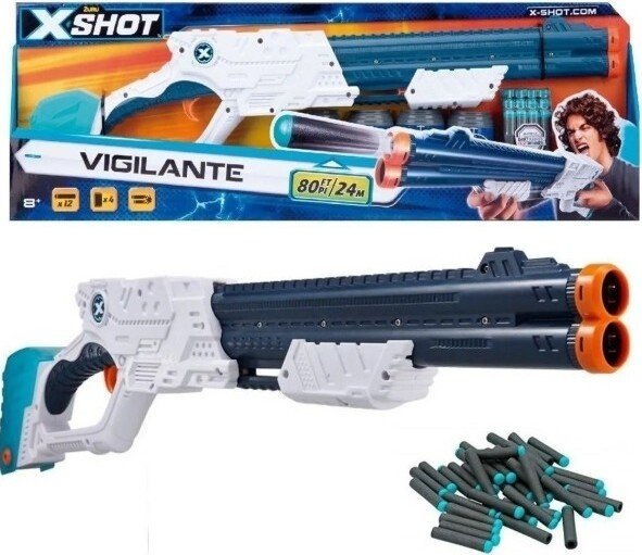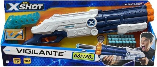 ¡El X-Shot Vigilante presenta dos cañones, un estilo perverso y dispara hasta 55 pies para ganar una guerra de blásters!